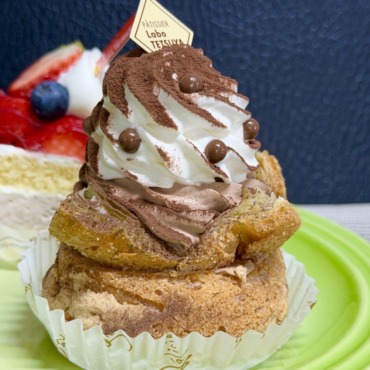 シュークリームをカットしてショコラ、生クリーム、バナナなど乗せたスイーツ。顔のように見える face pareidolia ( ´▽`)