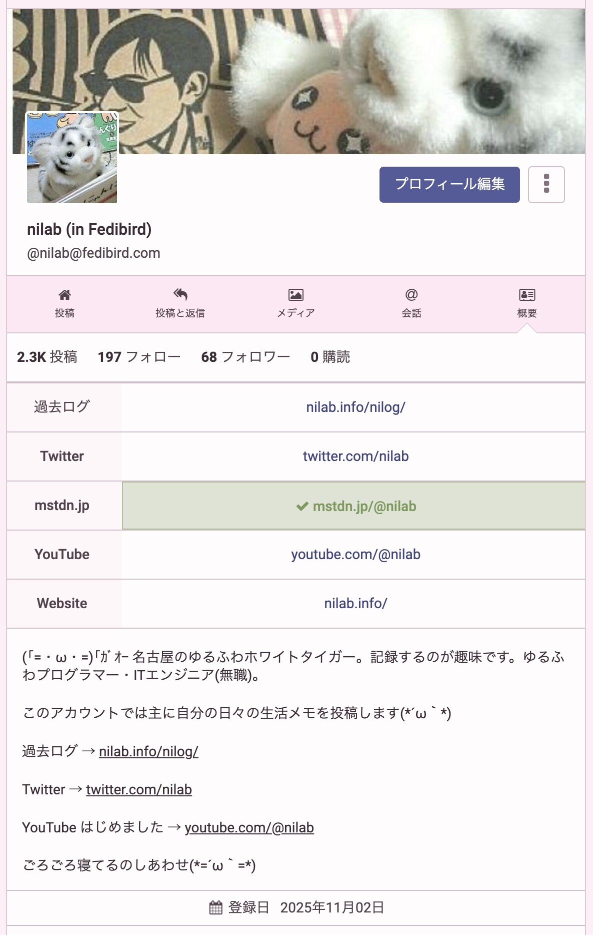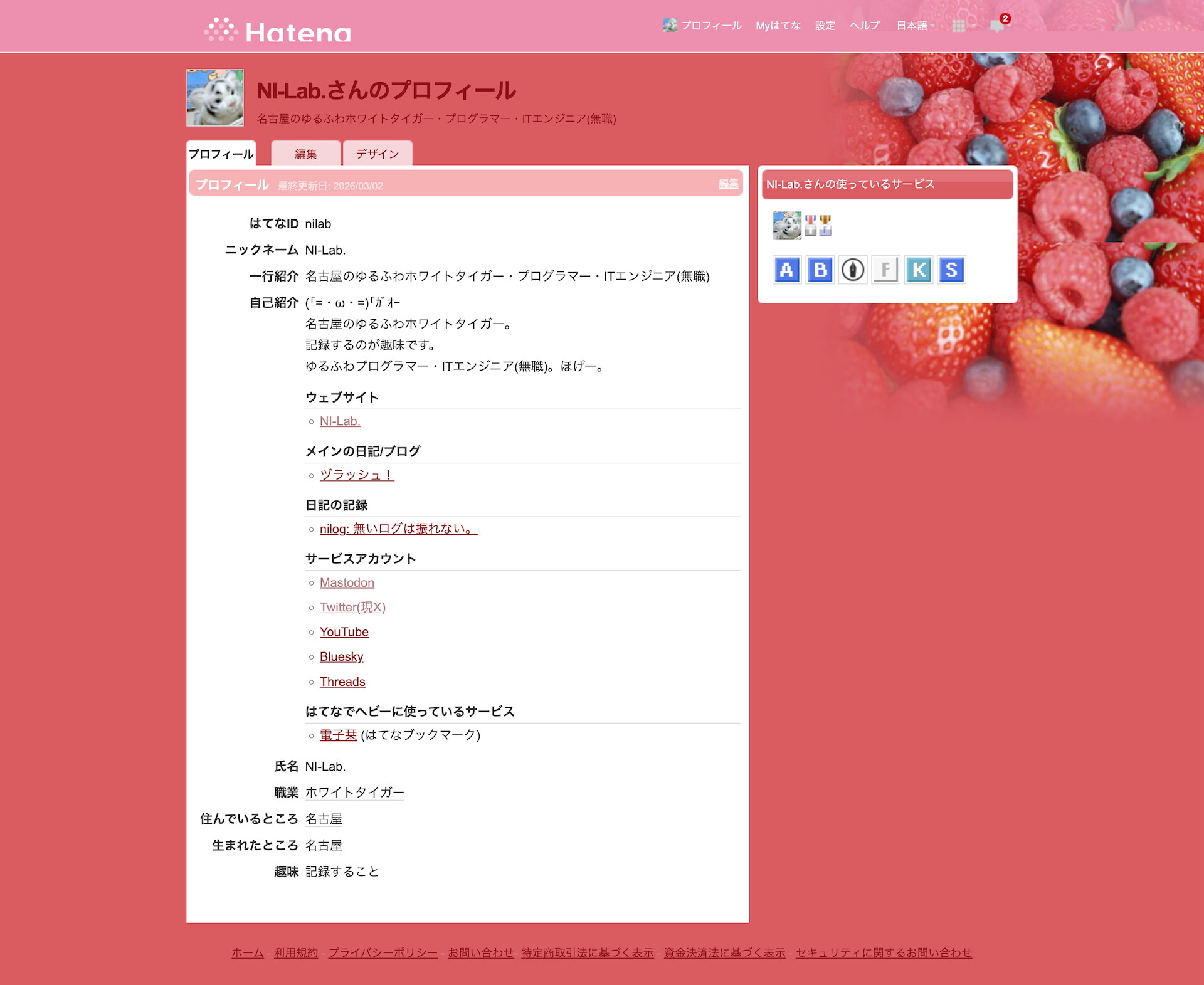 「職業/趣味プログラマ」を「名古屋のホワイトタイガー。ゆるふわプログラマー・ITエンジニア(無職)」などに変更したり他もちょっと修正したり。