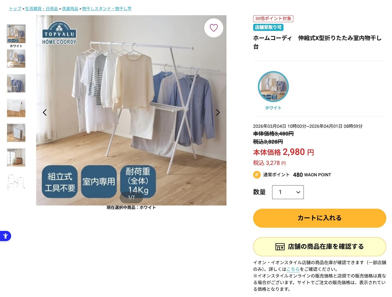 ホームコーディ 伸縮式X型折りたたみ室内物干し台 | イオンスタイルオンライン 衣料品・暮らしの品をネットでお買物 https://aeonretail.com/product/0/P-4973996088306/