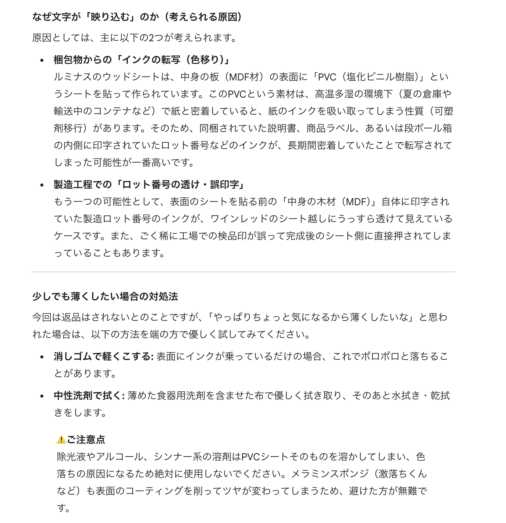 ウッドシートの文字映り込み現象について、Google Gemini Pro に聞いてみた。 「同梱されていた説明書、商品ラベル、あるいは段ボール箱の内側に印字されていたロット番号などのインクが、長期間密着していたことで転写されてしまった可能性」 「表面のシートを貼る前の「中身の木材(MDF)」自体に印字されていた製造ロット番号のインクが、ワインレッドのシート越しにうっすら透けて見えているケース」 「消しゴムで軽くこする: 表面にインクが乗っているだけの場合、これでポロポロと落ちることがあります」 「中性洗剤で拭く: 薄めた食器用洗剤を含ませた布で優しく拭き取り、そのあと水拭き・乾拭きをします」 「除光液やアルコール、シンナー系の溶剤はPVCシートそのものを溶かしてしまい、色落ちの原因になるため絶対に使用しないでください。メラミンスポンジ(激落ちくんなど)も表面のコーティングを削ってツヤが変わってしまうため、避けた方が無難です」