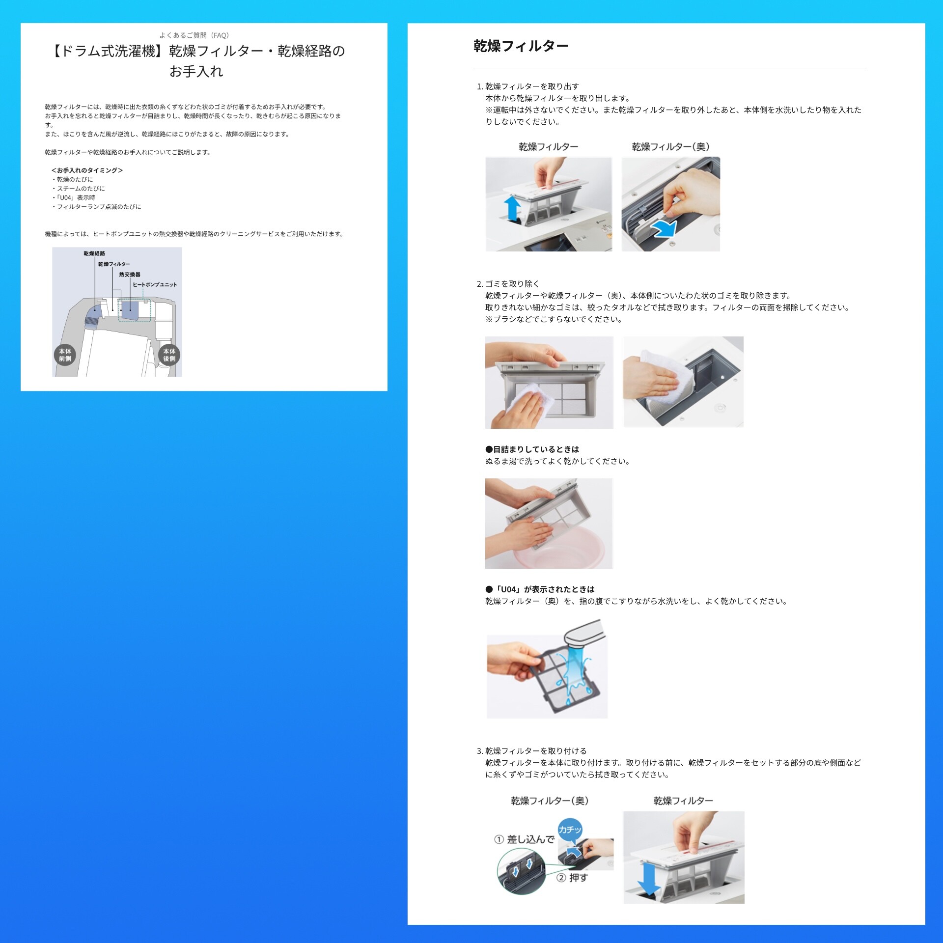 「乾燥フィルターには、乾燥時に出た衣類の糸くずなどわた状のゴミが付着するためお手入れが必要です。お手入れを忘れると乾燥フィルターが目詰まりし、乾燥時間が長くなったり、乾きむらが起こる原因になります。また、ほこりを含んだ風が逆流し、乾燥経路にほこりがたまると、故障の原因になります。」