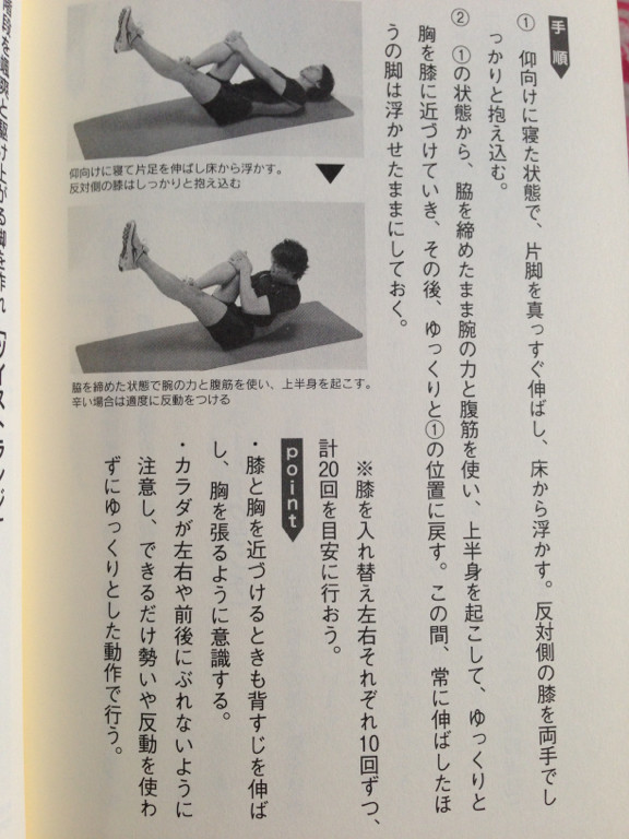 ニーホールドクランチ。背中、腕、腹、脚を同時に鍛えられるらしい。なんとなく負荷が分散しちゃう気がするんだけど。 - 読む筋トレ (扶桑社新書) / 森俊憲 http://mono.hatena.ne.jp/mono/wtneAULnz2#/nilab/wthNj58z8z