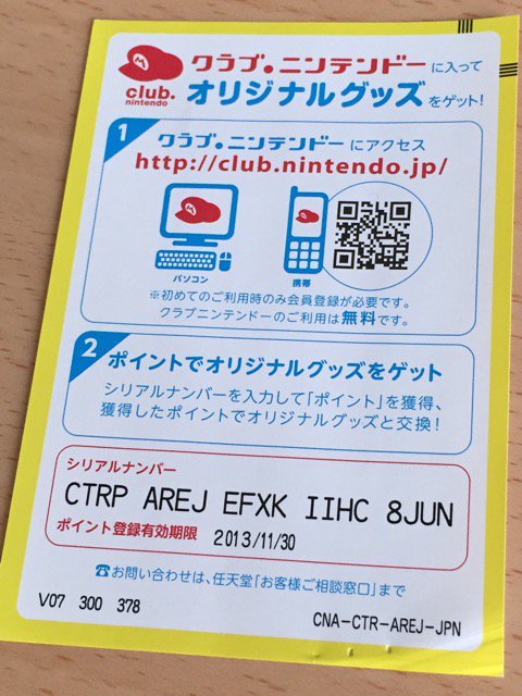 中古で買ったゲームの中に入ってたクラブニンテンドーのシリアルナンバーカード。有効期限切れてた。 http://twitter.com/nilab/status/723726731450830849/photo/1
