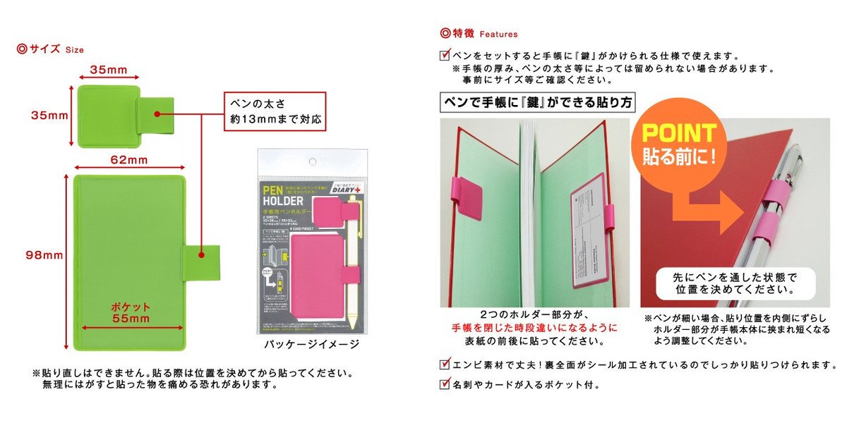 「両方に通したペンが鍵の役目となって、鞄の中などで手帳がひらかないようにしっかり閉じられます」「ペンの太さは約13mmまで対応」