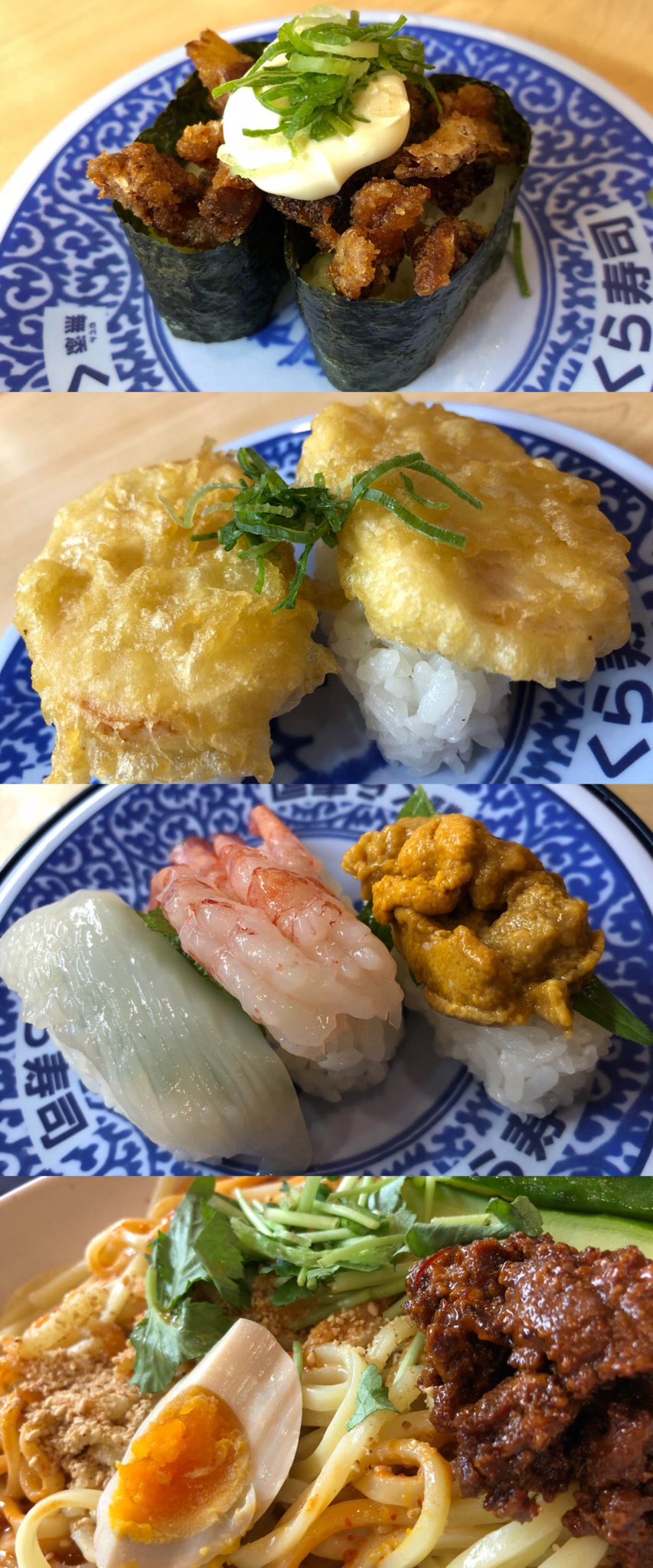 くら寿司、極旨鮭皮、鶏天寿司 (チキンナゲットみたいな)、うに、甘えび、真いか、コク旨冷やし坦々麺。
