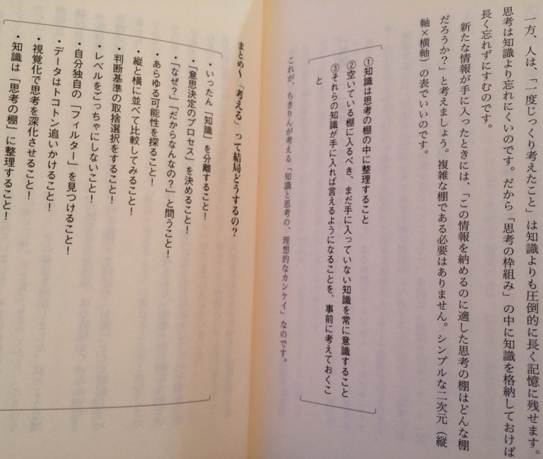 -nilog: 一度じっくり考えたことは知識よりも長く記憶に残る。知識は思考の棚に整理する。 - 自分のアタマで考えよう 知識にだまされない思考の技術 http://t.co/d4FlUO1MAZ (2013-11-02)