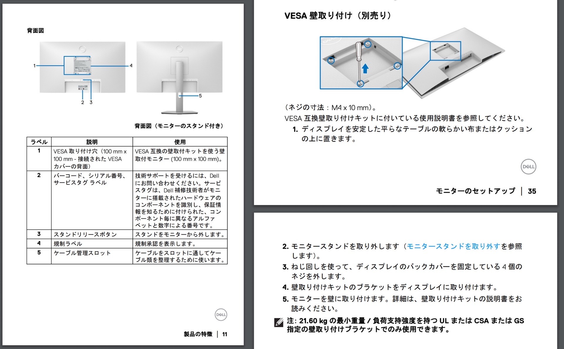 -nilog: VESA取り付け規格 100mm x 100mm。モニタースタンド無しの本体重量は5.4kg。 『Dell S2722DCモニター ユーザーズ ガイド』 (2025-02-02)