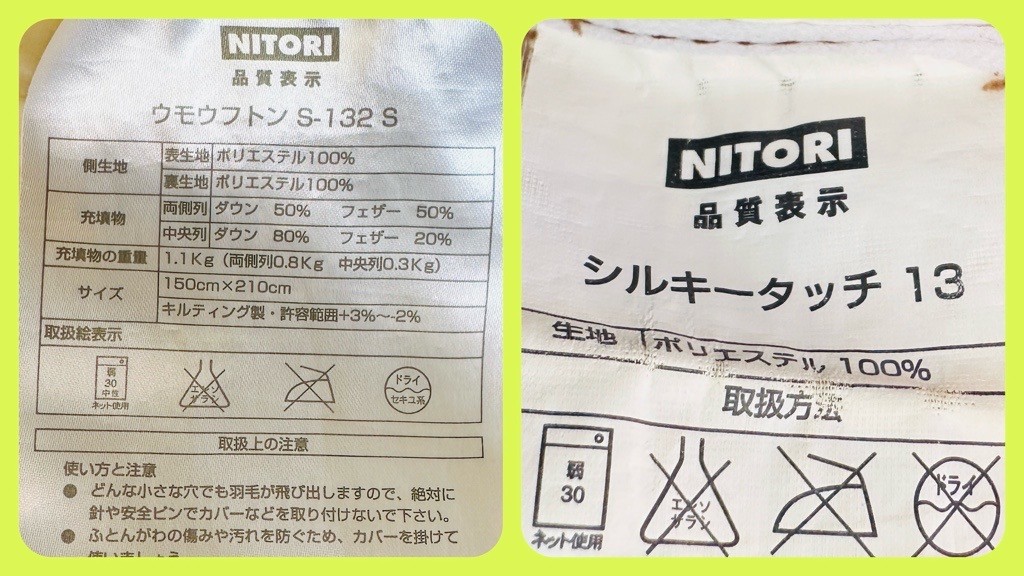 -nilog: 冬に使っているニトリの羽毛布団『ウモウフトン S-132 S』、いつ買ったものだろうかと調べてみたらちょうど10年前に買ったものだった。カバー『シルキータッチ 13』も同じ時期に買ったもの。 (2023-12-24)