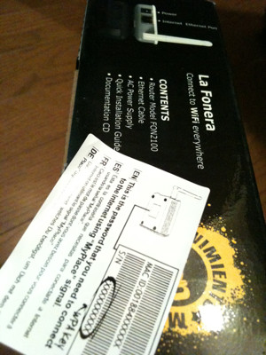 -nilog: ラフォネラの下部に書いてあるシリアルナンバーがWPA Keyだったり。 - La Fonera FON2100E (2011-04-29)