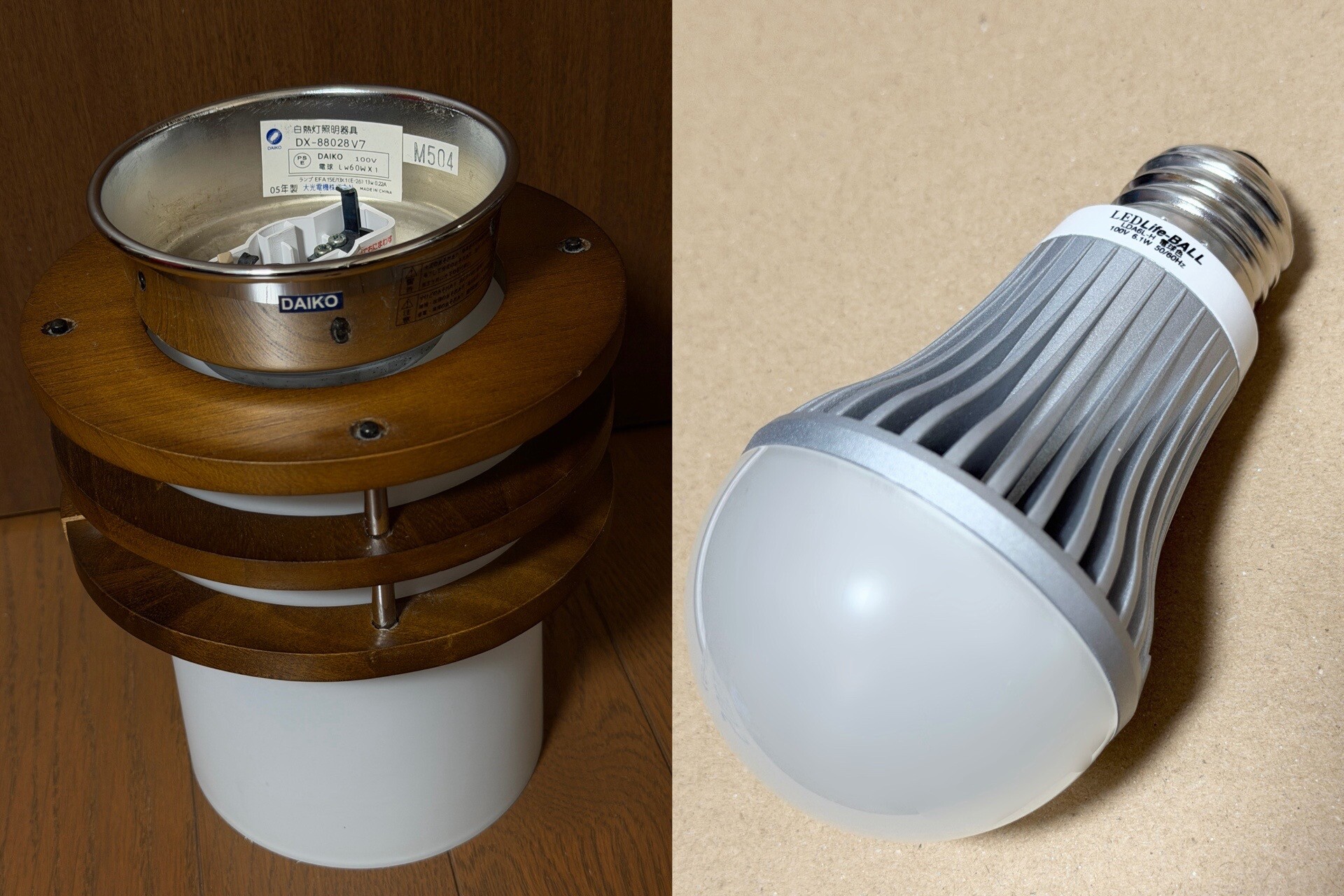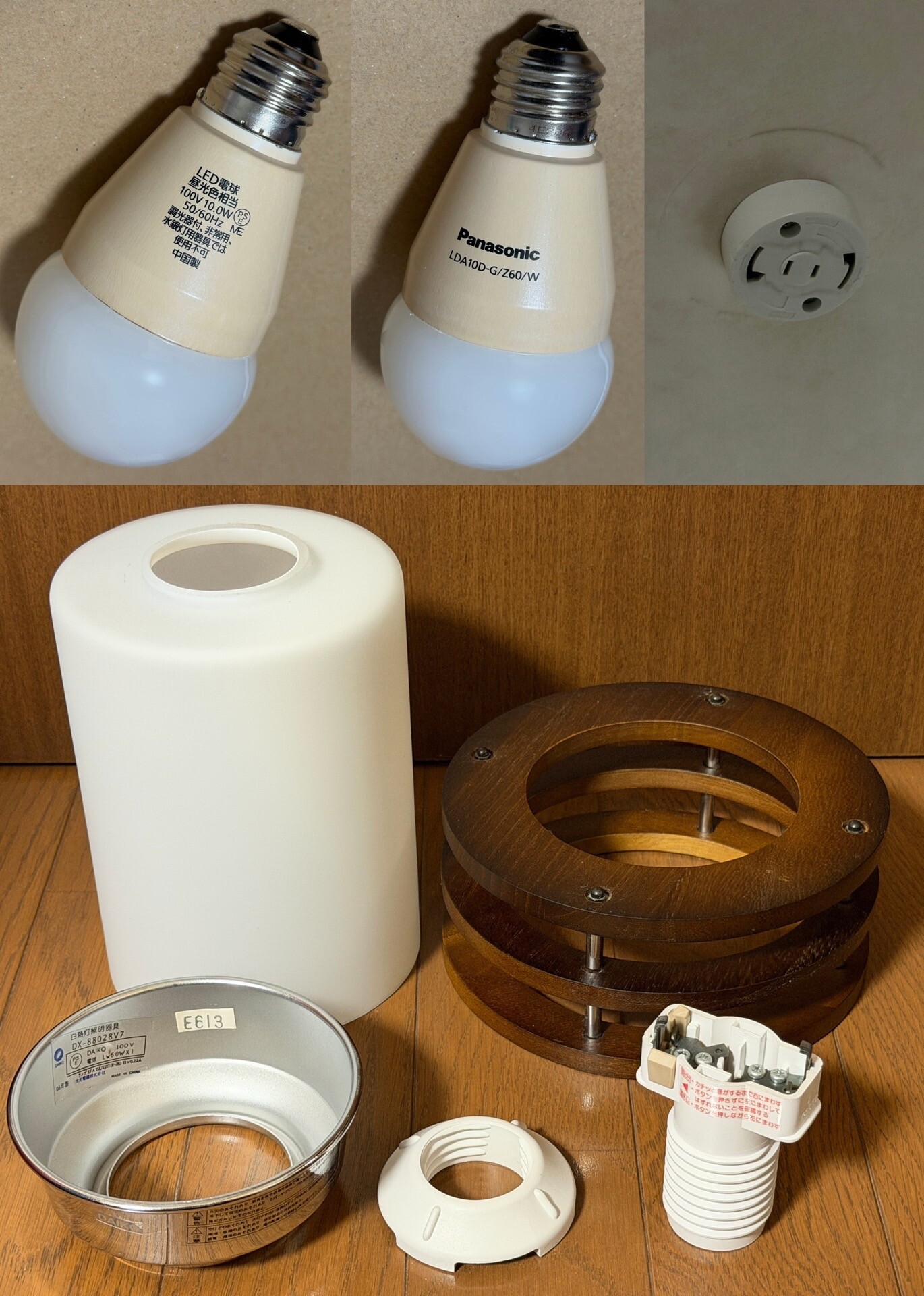 -nilog: 大光電機 シーリングライト DAIKO DX-88028V7 2006年製 + LED電球 Panasonic LDA10D-G/Z60/W。LED電球は2013年に購入したものかも(覚えていない)。だいぶ暗くなっていたのでいったん取り外して掃除。電球交換したいが代替品が手元にないのでまた後日に交換する予定。ただこれもう製造から20年ぐらい経っているので照明器具自体を交換したほうが良いのかも。 (2026-04-15)
