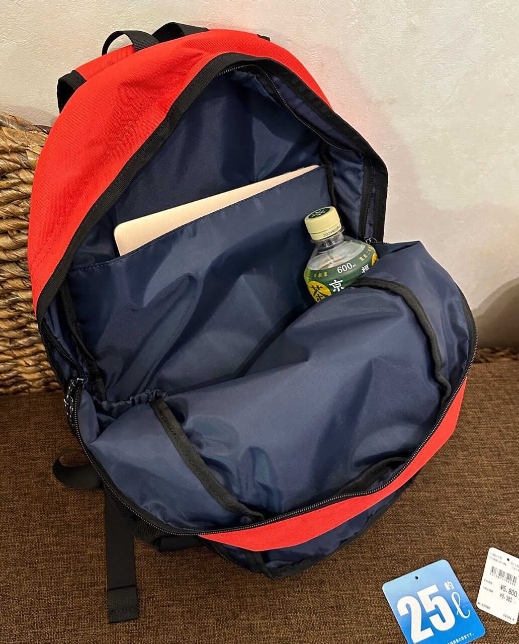-nilog: LOGOS Park ディパックMは、内側にもペットボトルが2本入る。「内装にボトルがすっきり納まるポケット付き」とのこと。大きめのポケットには MacBook Air 13インチが入った。 (2023-08-02)