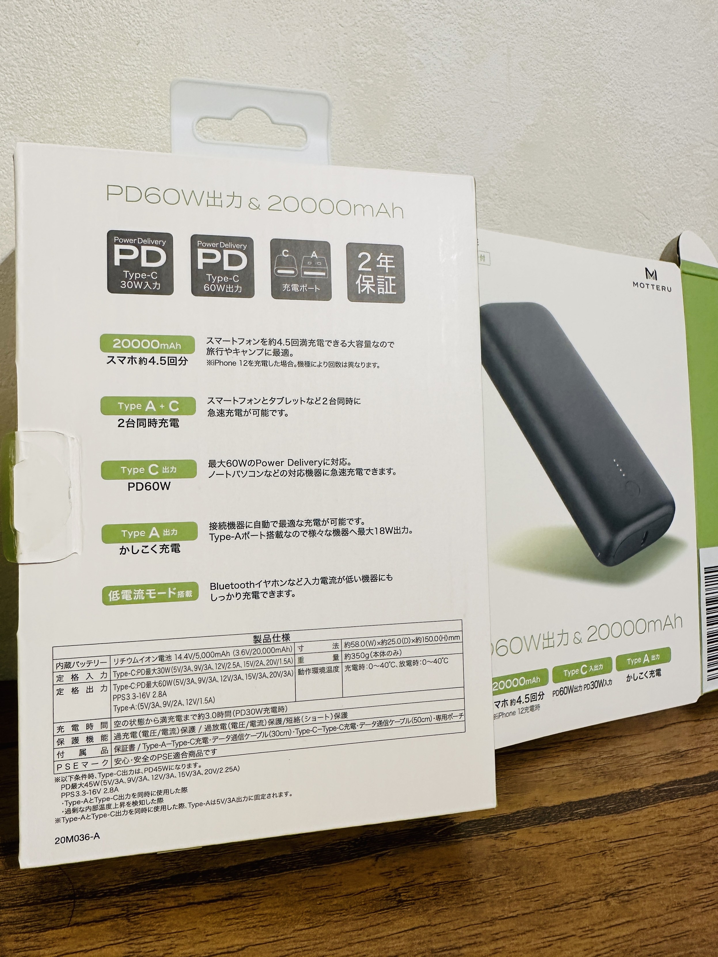 -nilog: MOTTERU モバイルバッテリー MOT-MB20001-BK を Amazon マケプレの MOTTERU にて7990円で購入。 「PD60W出力対応の20,000mAhモバイルバッテリーでは国内最小クラスで重さは約350g。 スマートフォン4回以上充電可能です」 「USB Power Delivery60Wにも対応しており、スマホからノートPCまでスピード充電」「Power Delivery出力時は本体LEDが緑色に光ってお知らせ」 「PD最大30W(12V×1.5A)入力なら、わずか3時間でモバイルバッテリー本体を満充電に」 MOTTERU (モッテル) モバイルバッテリー 20000mAh 大容量 PD60W 出力 PD30W 入力 ノートPC サブバッテリー MacBook Pro iPad iPhone Apple Watch Android Windows PC 各種対応 PPS対応 USB-C入出力 USB-A出力 低電流モード搭載 PSE対応 電熱ベスト対応 スモーキーブラック MOT-MB20001-BK (2023-10-09)