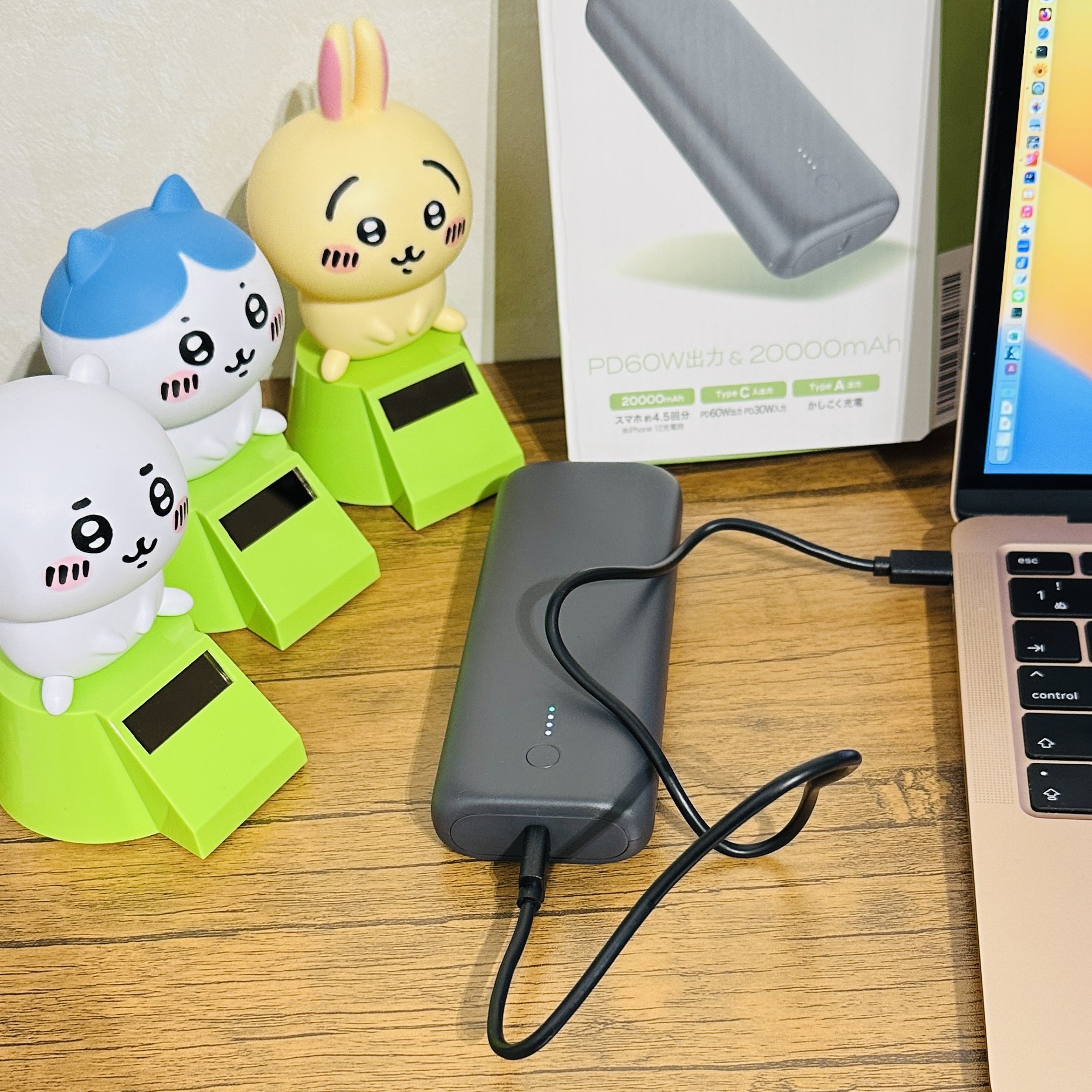 -->・重さ約350g 国内最小クラス PD60W出力20,000mAhモバイルバッテリー:PD60W出力対応の20,000mAhモバイルバッテリーでは国内最小クラスで重さは約350g。 スマートフォン4回以上充電可能です。 (iPhone12 Pro/12/11 Pro/11で約4.5回、iPad Airで約1.6回、Mac Book Proで約2回、ポータブルゲーム機で約3回) 安心の大容量なので、持ち運びにも安心です。