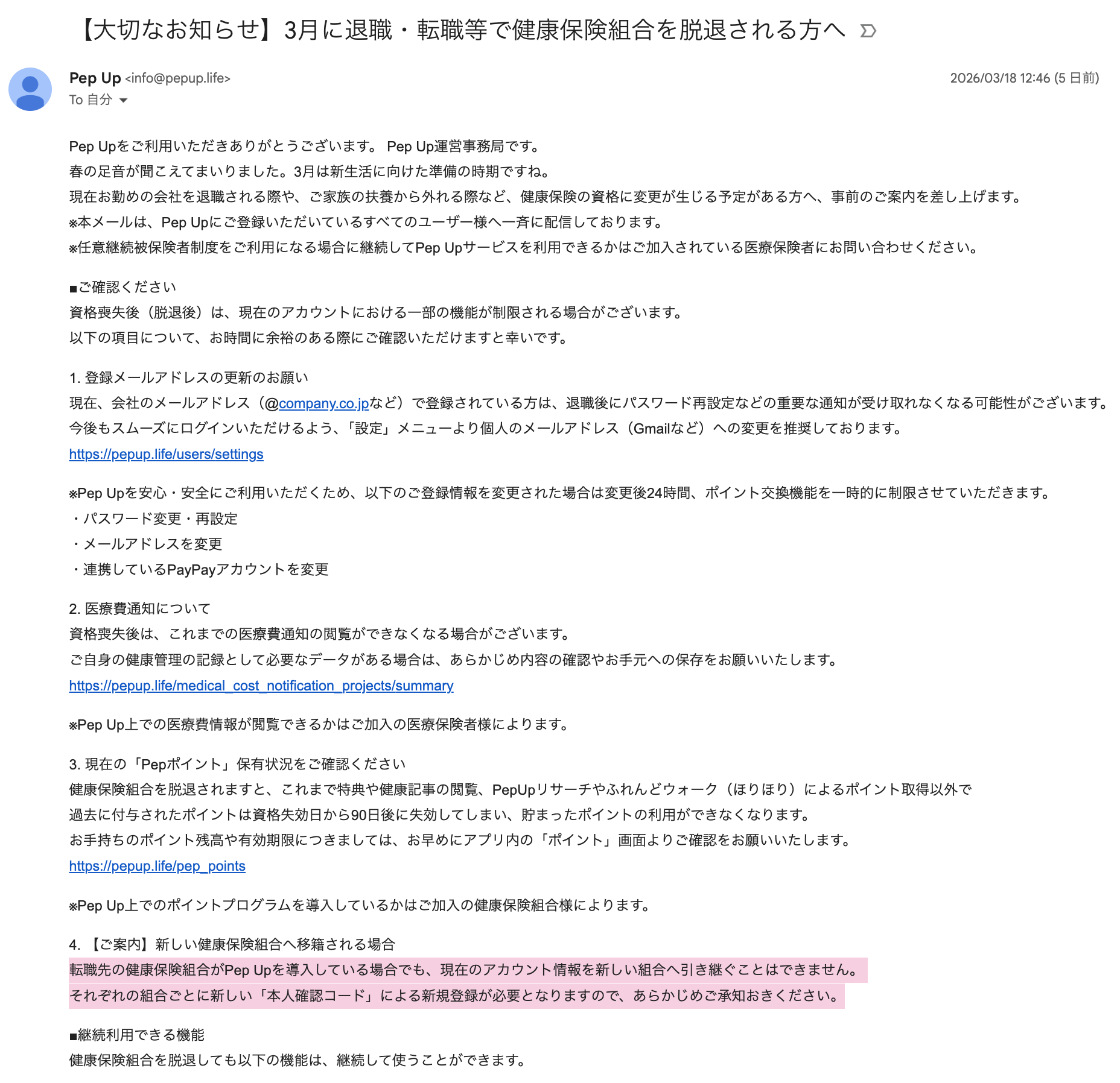-nilog: 数日前に来た Pep Up からのお知らせメール。退職しても Pep Up アカウントは自動で削除されないみたい。健康保険組合が変更になる場合は新規アカウント登録が必要とのこと。 「転職先の健康保険組合がPep Upを導入している場合でも、現在のアカウント情報を新しい組合へ引き継ぐことはできません。それぞれの組合ごとに新しい「本人確認コード」による新規登録が必要となりますので、あらかじめご承知おきください。」 (2026-03-23)