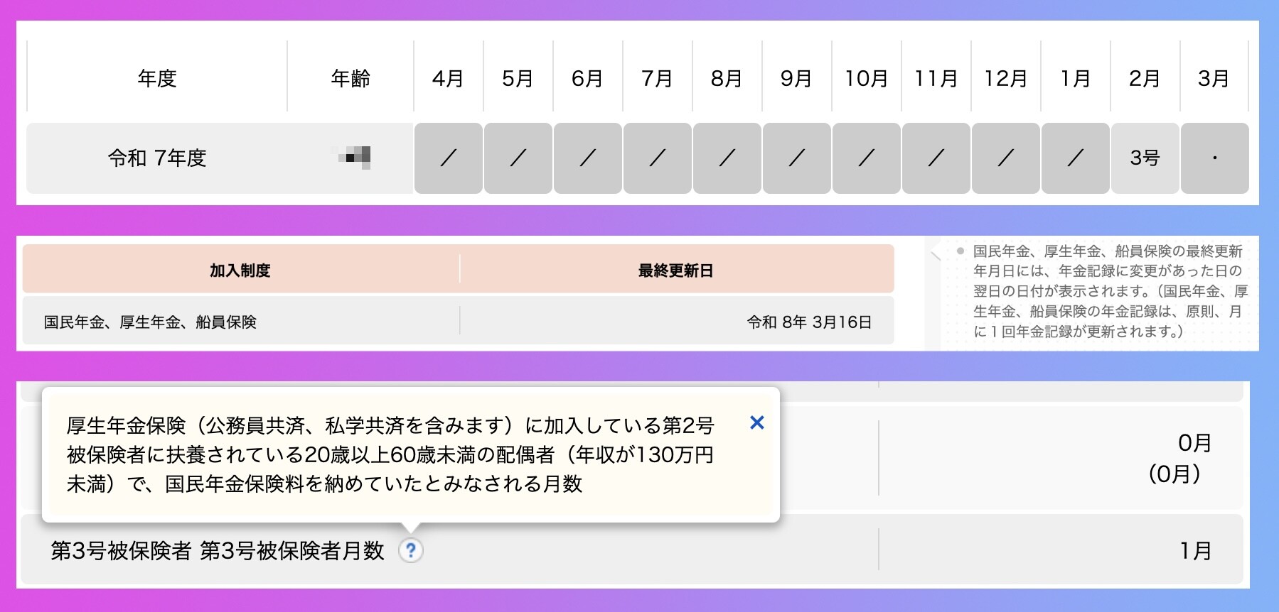 -nilog: ねんきんネットを確認したら、国民年金第3号被保険者になってた。やっとデータが反映された(∩´∀`)∩ワーイ (2026-03-24)