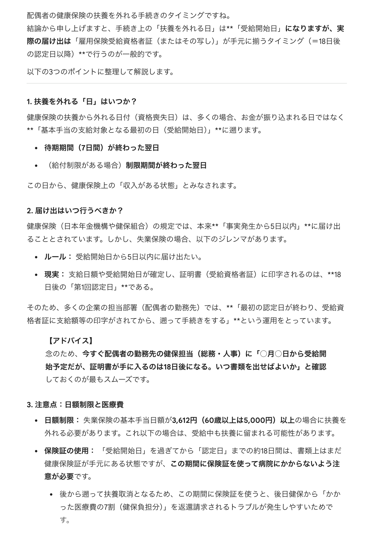 -nilog: Gemini に「雇用保険の受給開始日から配偶者の健康保険の被扶養者でなくなるため手続きをしたいのですが、実際に支給が確定するのは自分の場合は18日後になります。配偶者の健康保険への届け出はいつ行うのが良いのでしょうか。」と聞いた結果。何かあったときに病院に行きづらいなぁ(;´∀`) Gemini曰く 「健康保険(日本年金機構や健保組合)の規定では、本来「事実発生から5日以内」に届け出ることとされています」 「現実: 支給日額や受給開始日が確定し、証明書(受給資格者証)に印字されるのは、18日後の「第1回認定日」である」 「そのため、多くの企業の担当部署(配偶者の勤務先)では、「最初の認定日が終わり、受給資格者証に支給額等の印字がされてから、遡って手続きをする」という運用をとっています」 「保険証の使用: 「受給開始日」を過ぎてから「認定日」までの約18日間は、書類上はまだ健康保険証が手元にある状態ですが、この期間に保険証を使って病院にかからないよう注意が必要です」 「後から遡って扶養取消となるため、この期間に保険証を使うと、後日健保から「かかった医療費の7割(健保負担分)」を返還請求されるトラブルが発生しやすいためです」 (2026-04-17)