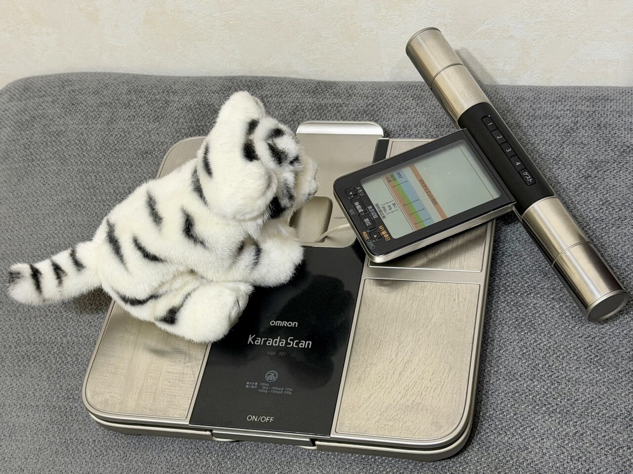 -nilog: 部位別の皮下脂肪率と骨格筋率が出るのは嬉しいんだけど、両手両足測定がめんどくて長く続かなかった。それに、電源入れてからユーザー選択に時間がかかりすぎるし手間。 - オムロン 体重体組成計 カラダスキャン HBF-701 (2013-03-10)