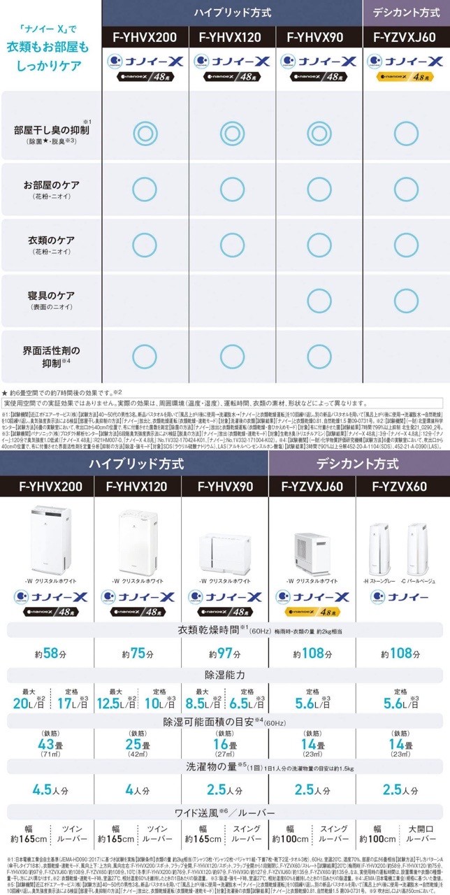 -nilog: パナソニック衣類乾燥除湿機、比較表。ハイブリッド方式。デシカント方式。 パナソニック 衣類乾燥除湿機 クリスタルホワイト F-YHVX120-W ハイブリッド式 ナノイーX搭載 ~25畳 (2023-12-23)