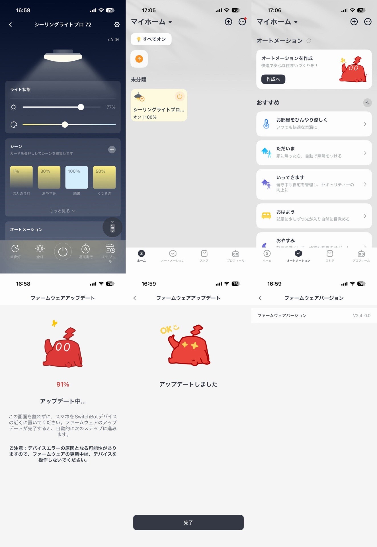 -nilog: SwitchBot アプリをインストール。先日設置したシーリングライトプロ 12畳 W2612250をアプリに追加してみた。まずはシーリングライトのファームウェアをアップデート。「シーリングライトプロ72」って表示されているけど何が72なんだろうか。。。 (2026-04-16)