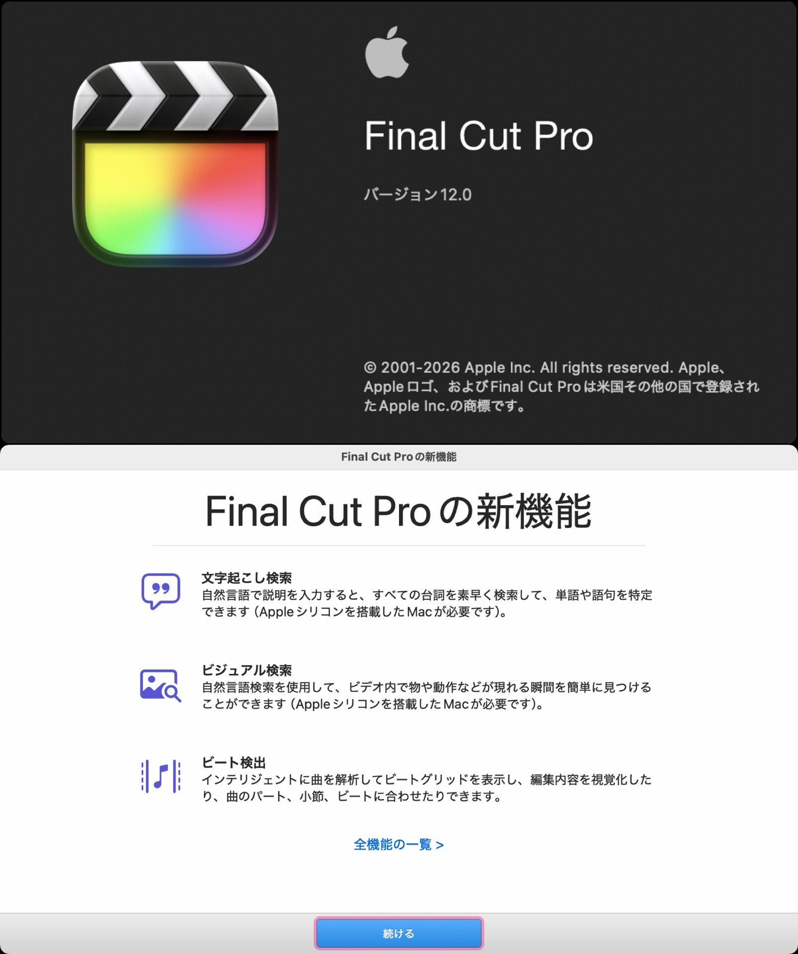-nilog: Final Cut Pro 12 にアップグレード。Final Cut Pro 11 を 2024年に5万円で買ったけど、今はサブスク版もあるんだね。 「Final Cut Proは、ビデオ、ミュージック、クリエイティブな画像処理用のアプリのサブスクリプションベースのコレクションであるApple Creator Studioに含まれるようになりました」「Final Cut Proは買い切りによって入手することもできます」 「自然言語で説明を入力すると、メディア内の話し言葉のダイアログを素早く検索して、単語や語句を特定できます」 「自然言語検索を使用して、映像内で物や動作などが現れる瞬間を簡単に見つけることができます」 「インテリジェントに曲を解析してビートグリッドを表示し、編集内容を視覚化したり、曲のパート、小節、ビートに合わせたりできます」 Mac用Final Cut Proの新機能 - Apple サポート (日本) (2026-01-31)