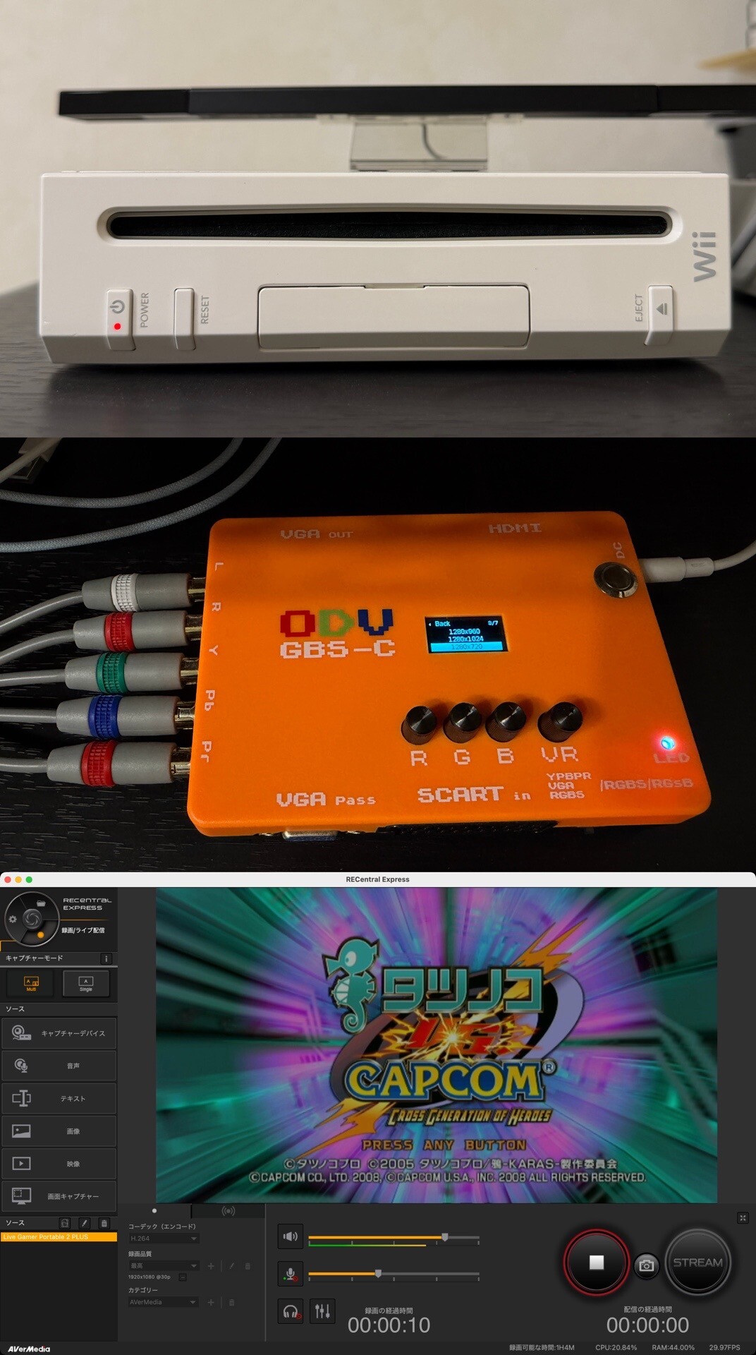 -nilog: Wii (ワイド設定 16:9) + Fosmon C1036HDAV Component Cable + ODV-GBS-C (Resolution設定 1280x720) + AVerMedia AVT-C878 PLUS + MacBook Air + Recentral Express で録画できた。録画した動画の解像度は 1920x1080 で、Wii や ODV-GBS-C の設定と同じ 16:9 なので、たぶん縦横比も問題ないだろうと思う(∩´∀`)∩ (2026-03-10)