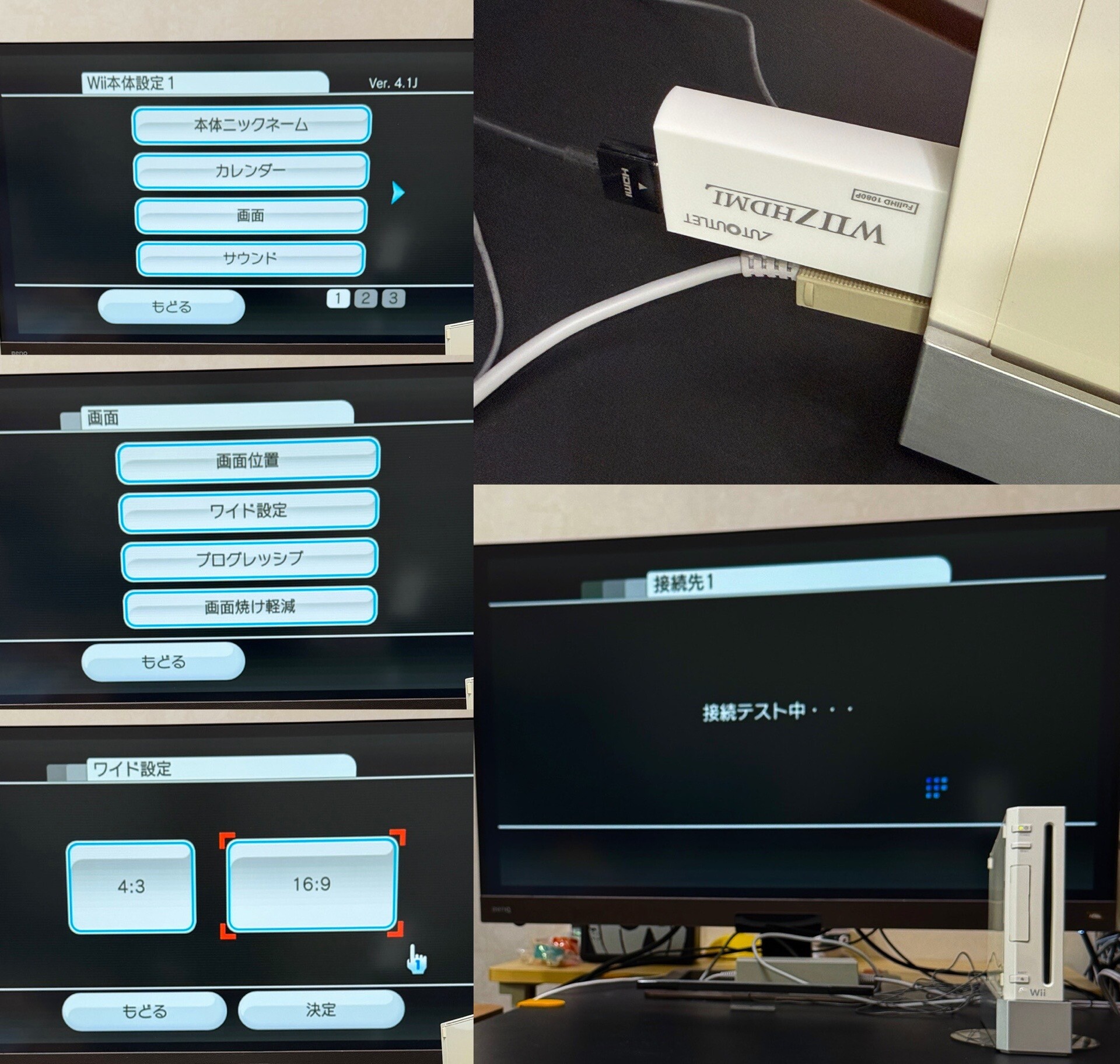 -nilog: Nintendo Wii 本体 → AUTOUTLET Wii2HDMI EFU006C → HDMIケーブル → BenQ EW3280U 32インチ ディスプレイで表示できた。音声もOK。ワイド設定は4:3でも16:9でも映ったけど16:9のほうが自然な縦横比になる。インターネットWi-Fi設定は「接続テスト中・・・」のまま先に進まず。アクセスポイントの問題なのかもうサポートされていないから接続できないのかはわからない。 (2026-01-18)