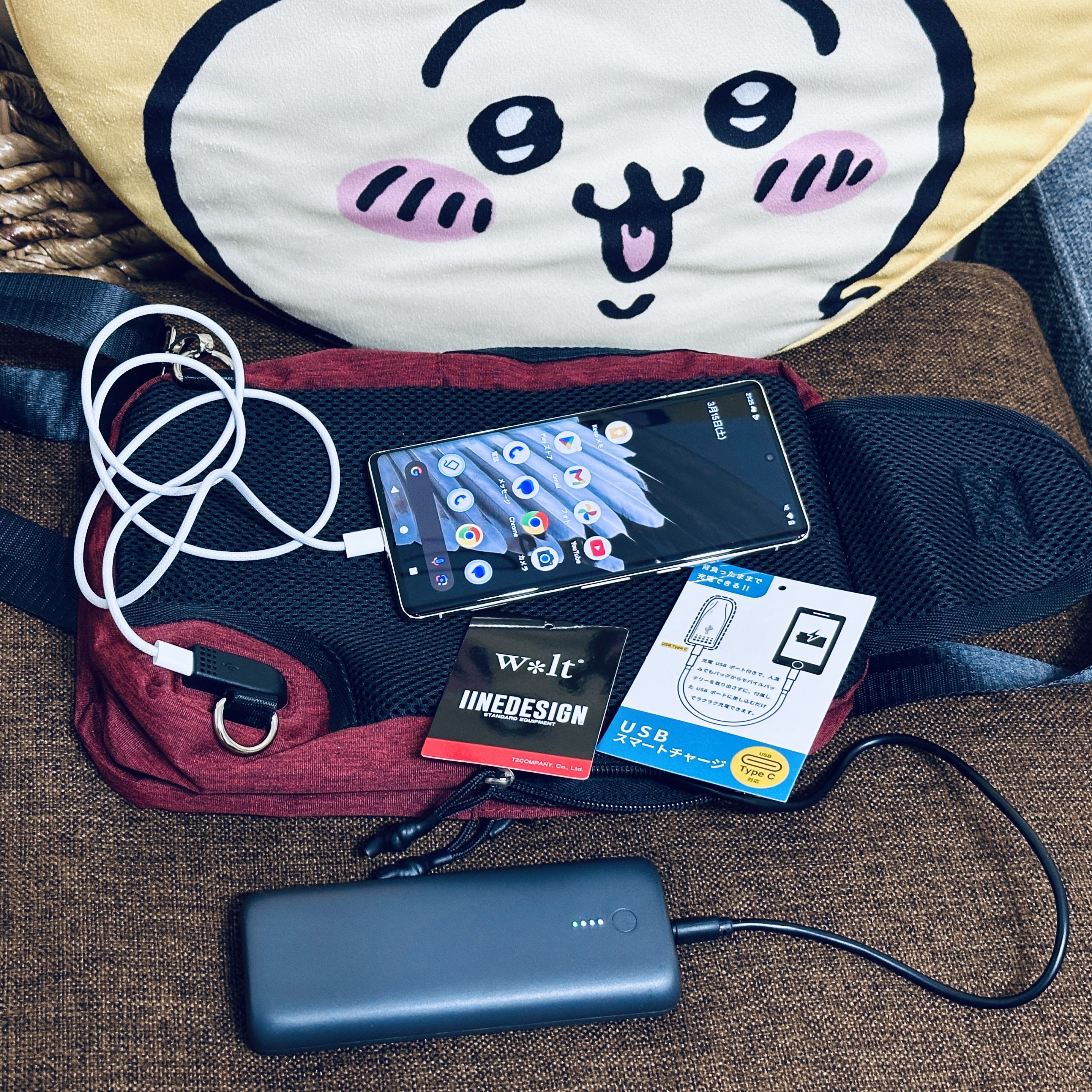 -nilog: Walt(ウォルト) ボディバッグ 537-084H。USBスマートチャージ機能を試す。バッグの中にある USB Type-C ケーブルにモバイルバッテリーを接続して、バッグ外側のUSBポート (USB Type -C) にケーブルを挿してスマートフォンを接続。ちゃんと充電できてる(*´∀`*) (2025-03-15)