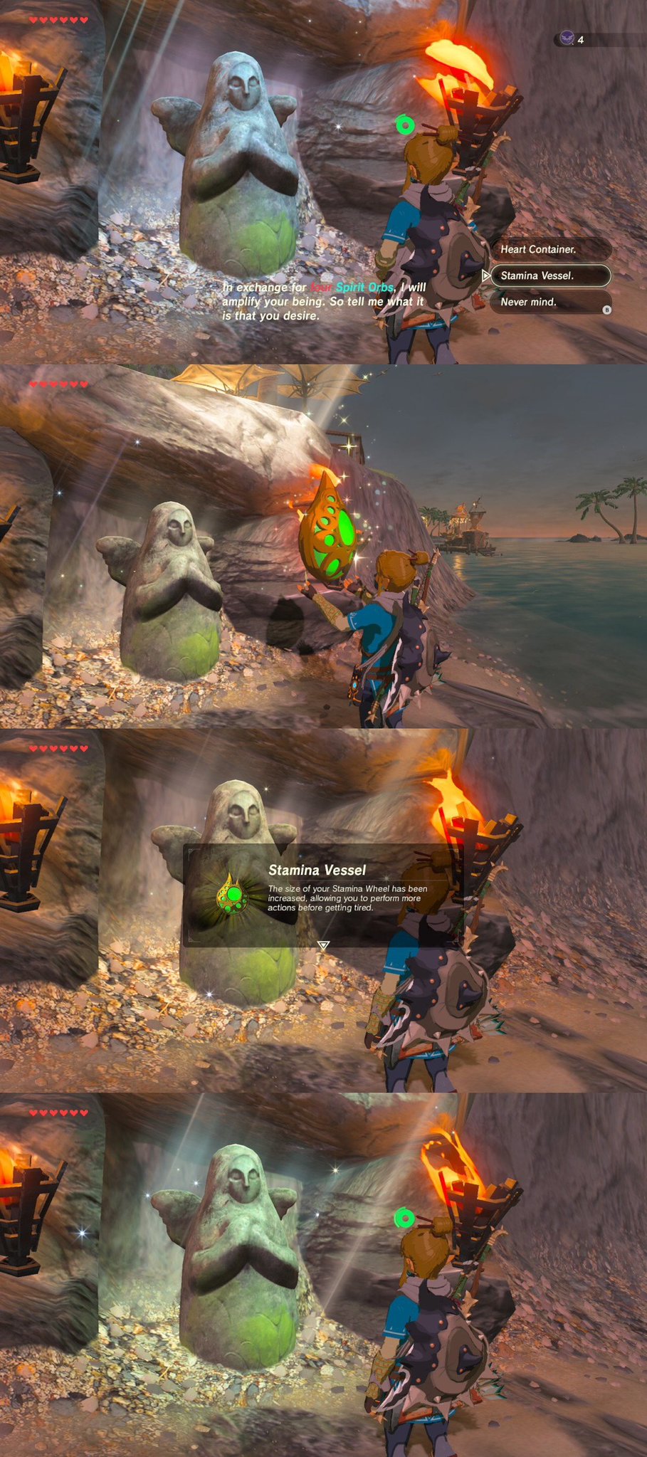 -nilog: はじめて「ハートの器」 Heart Container ではなくて「がんばりの器」 Stamina Vessel を選択した。4分の1だけがんばりゲージが増える。 #ゼルダの伝説 #BreathoftheWild #NintendoSwitch (2019-02-16)