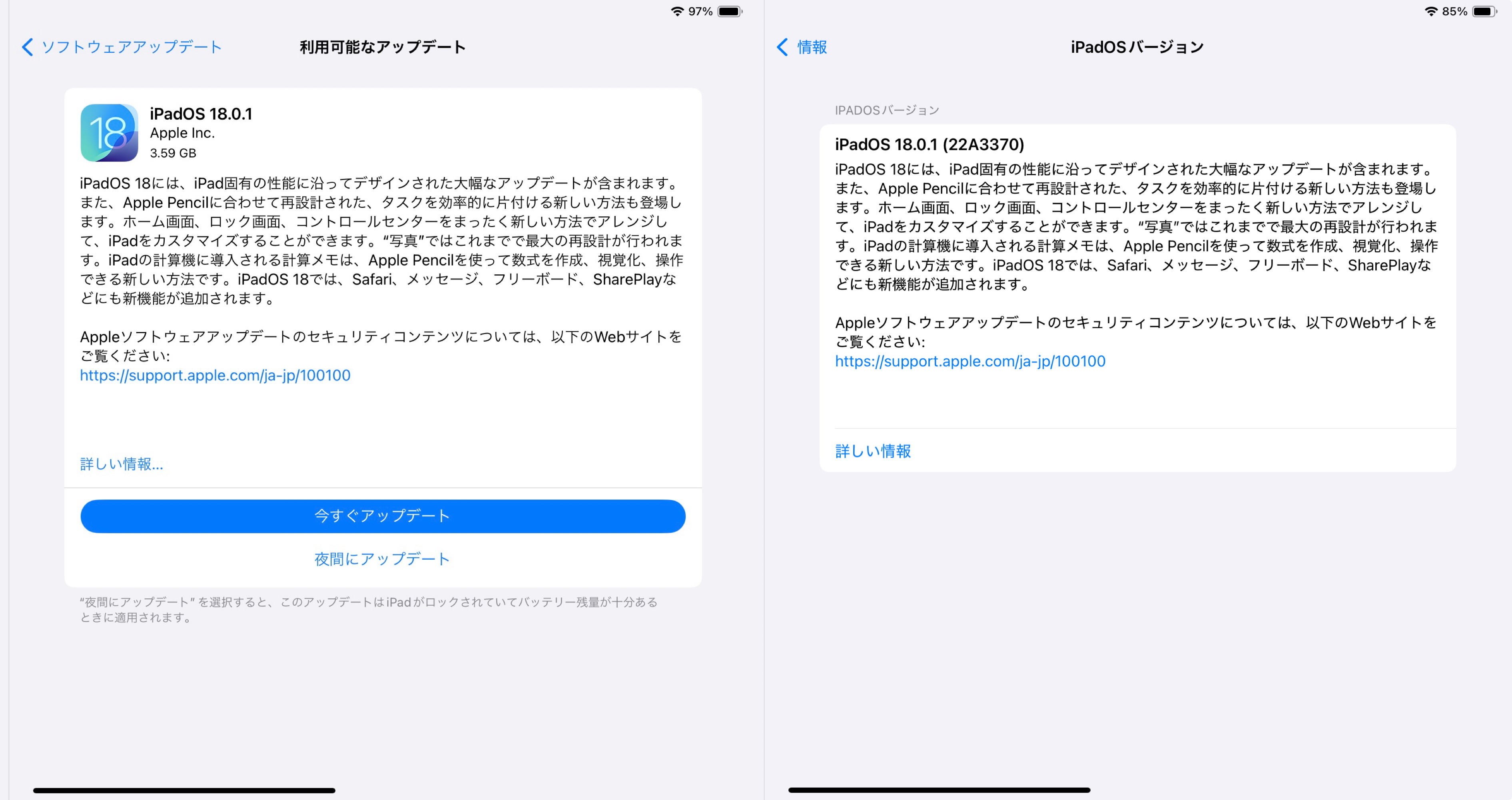 -nilog: iPad Pro 2018 を iPadOS 17 から iPadOS 18 へアップグレードだん。この iPad Pro、もう6年ぐらい使っているのか。。。 (2024-10-09)