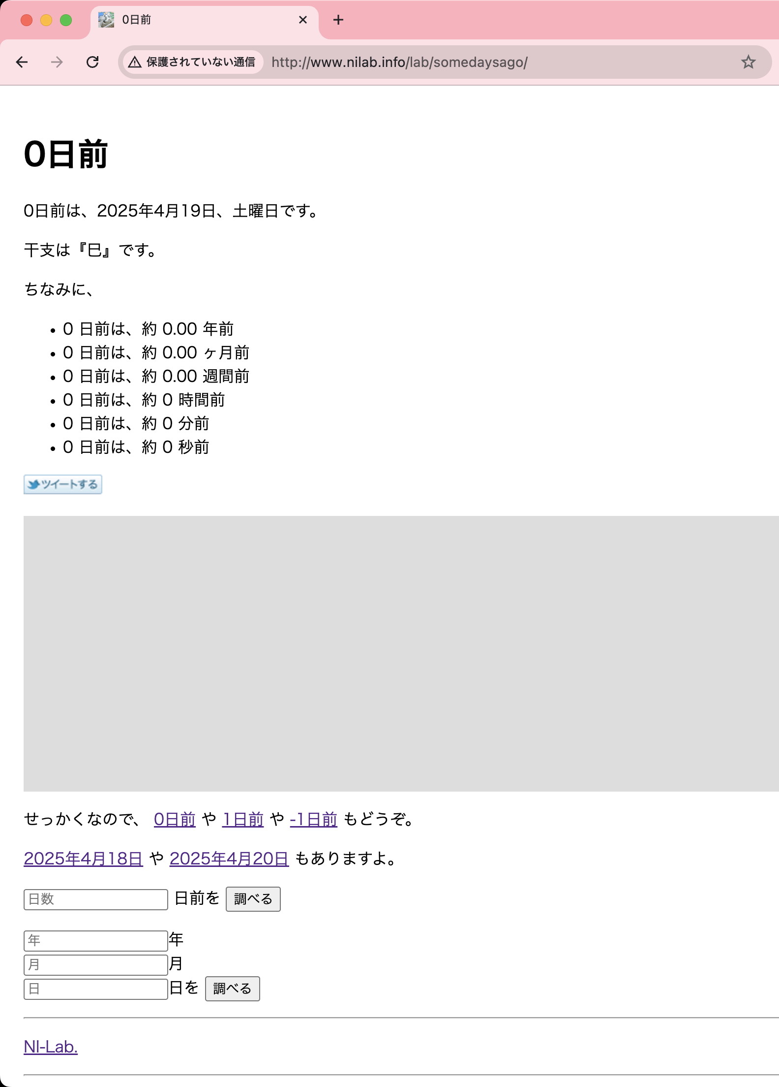 -nilog: Google Cloud App Engine + Ruby + Sinatra + Mustache で動いていた『0日前 somedaysago』をクライアント JavaScript で動作するように作りなおした。 いつか自分で書き直そうと思っていたけど、ChatGPT にお願いしたらほぼ一発でちゃんと動作するものが出来たのでとてもラクができた(*´∀`*) このシステムは元々はたぶん2011年に CGI + Ruby で作ったもの(たぶん)。 0日前 (2025-04-19)