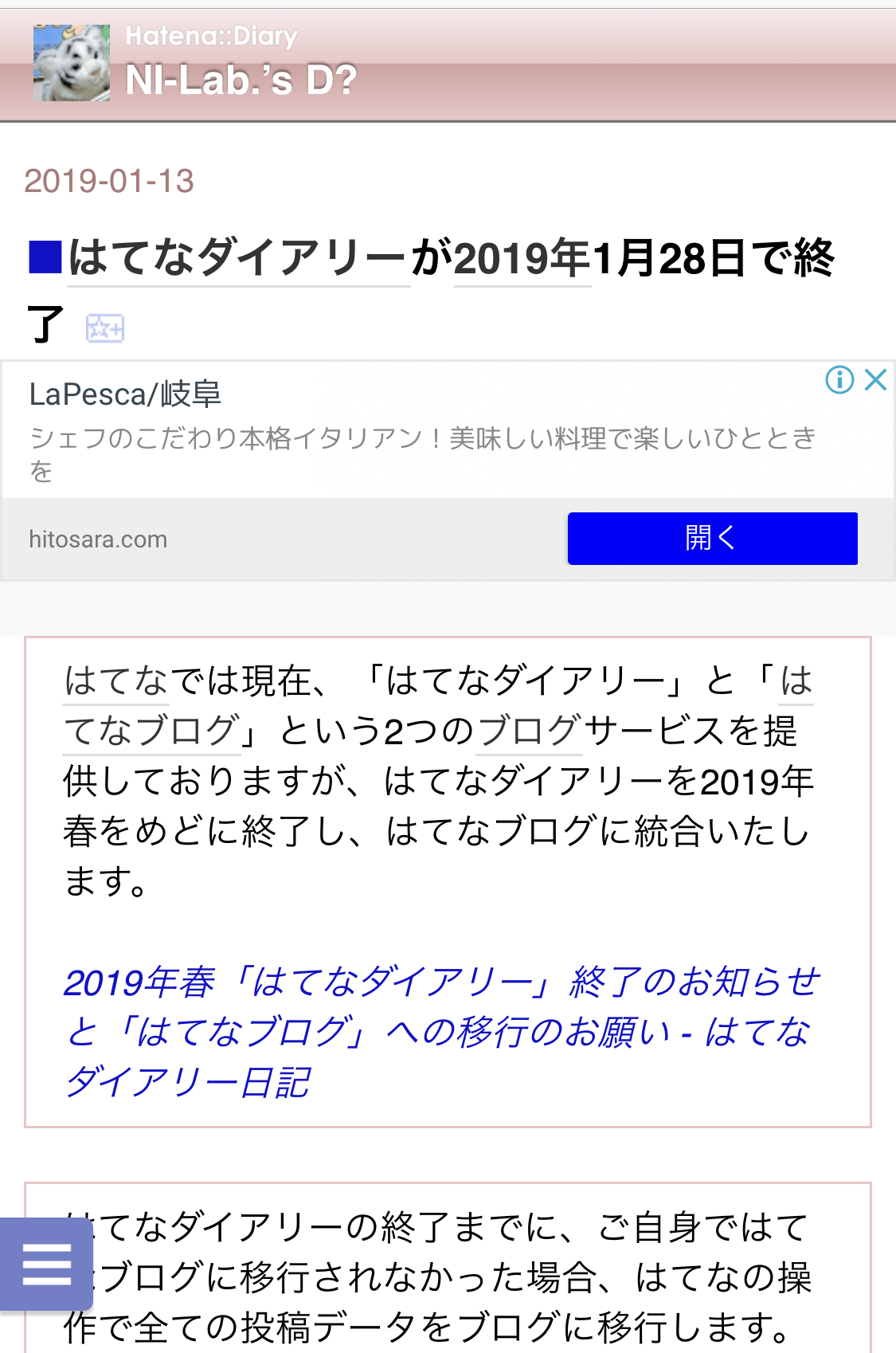 → はてなダイアリーが2019年1月28日で終了 - NI-Lab.’s D?