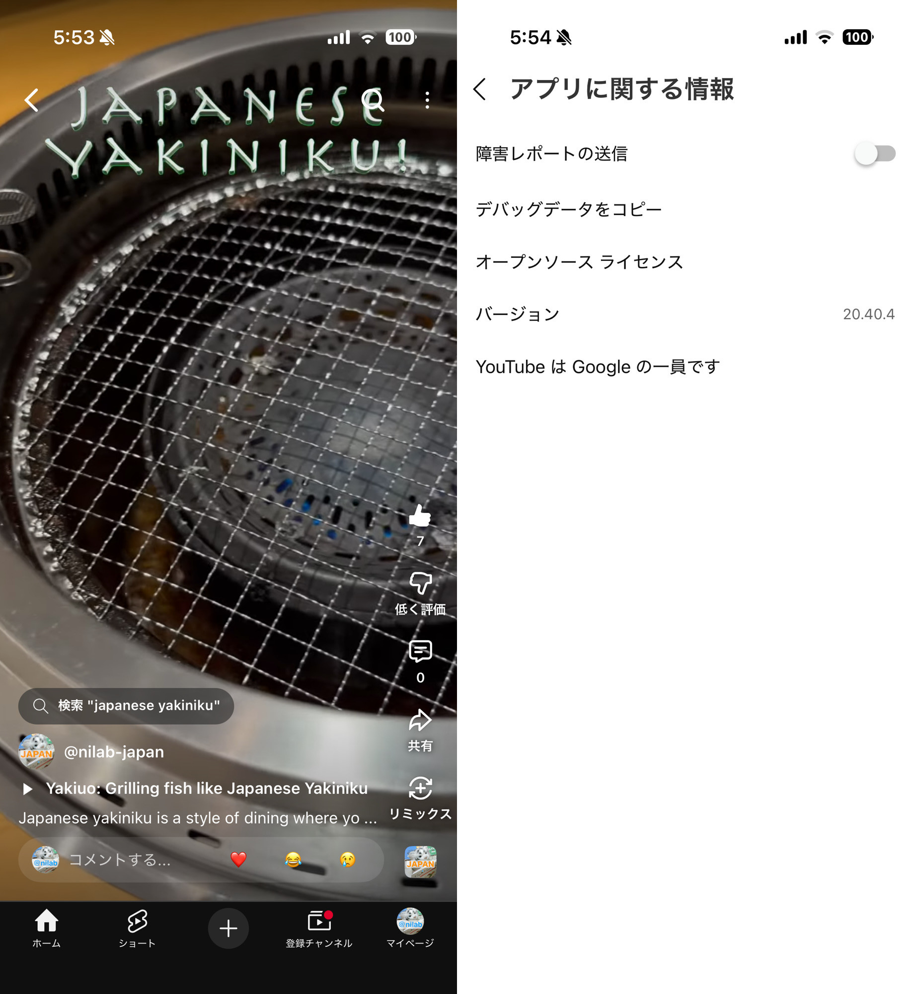 iPhone 14 Pro + iOS 18 + YouTube アプリ 20.40.4