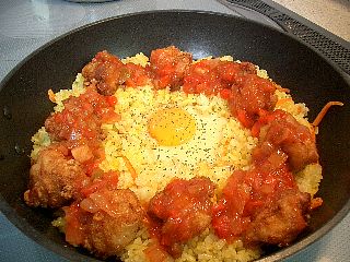 We put fried chikens, a sunny-side up, and salsa sauce.